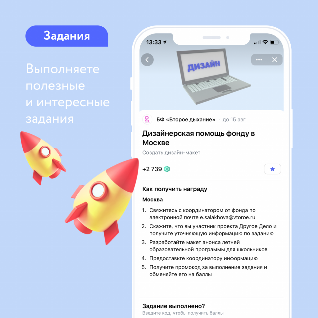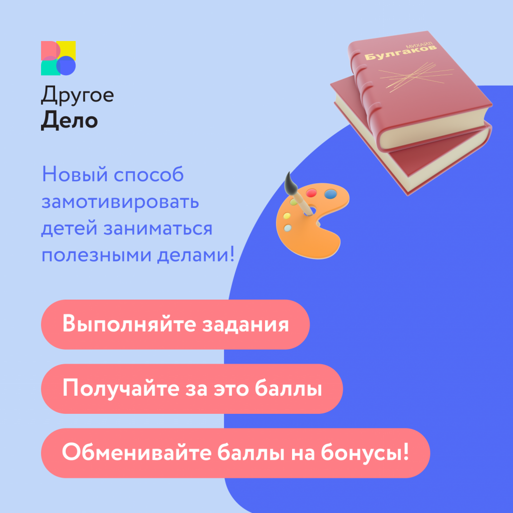 Платформа «Другое Дело», где каждый может получать бонусы за выполнение классных и полезных заданий. Добрый день! Наверняка, вы знаете, что полезные привычки привить сложно. Для этого мы создали уникальную платформу «Другое Дело», где каждый может получать бонусы за выполнение классных и полезных заданий. Объясняем ниже, как замотивировать себя на полезные дела с помощью нашего приложения. Где найти нашу платформу? Наш проект существует как приложение внутри социальной сети «Вконтакте» Какие задания надо выполнять? Задания направлены на всестороннее развитие, социальную активность и здоровые привычки: баллы можно заработать на занятиях спортом, чтении книг, посещении выставок, прогулках с собаками и мнооогих других видах активностей. Есть задания и для детей, поэтому можете смело привлекать их к полезным задачам, мотивируя бонусами! Как принять участие? — Регистрируйтесь в приложении — Выполняйте задания (кстати, многие из них можно выполнять вместе с детьми!) — Получайте баллы — Обменивайте баллы на бонусы! Какие бонусы можно получить? Мы договорились с партнерами и сделали бонусы очень разнообразными: это незаменимые компьютерные товары от Kingston, скидки на авиабилеты от S7, подписки на онлайн-сервисы Wink, Premier или More.tv, и даже экскурсия на космодром «Восточный». Также есть возможность получить образовательные программы от SkillBox и Uchi.ru. Ссылка на приложение: https://vk.com/dd_app
