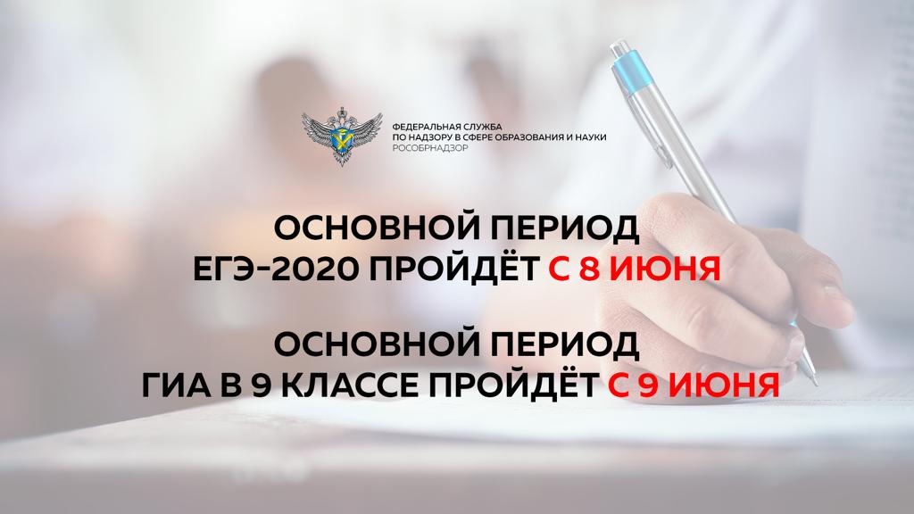 Срок начала основного периода единого государственного экзамена (ЕГЭ) 2020 года будет перенесен на 8 июня, основного государственного экзамена (ОГЭ) для выпускников 9 классов – на 9 июня. Такие решения готовятся Министерством просвещения Российской Федерации и Федеральной службой по надзору в сфере образования и науки в связи с со складывающейся эпидемиологической обстановкой и объявлением нерабочими дней с 30 марта по 3 апреля.