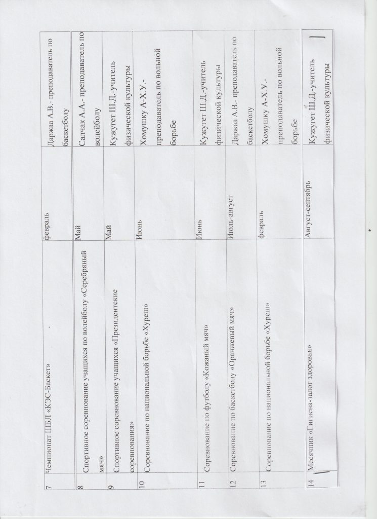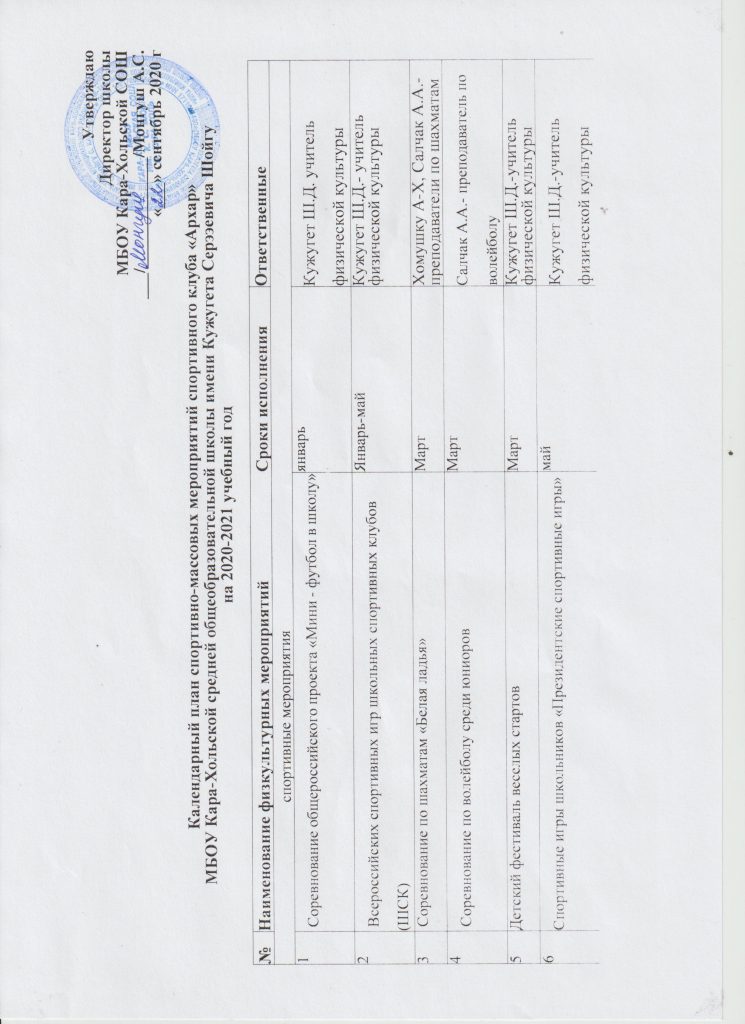 Календарный план спортивно-массовых мероприятий школьного спортивного клуба «АРХАР»